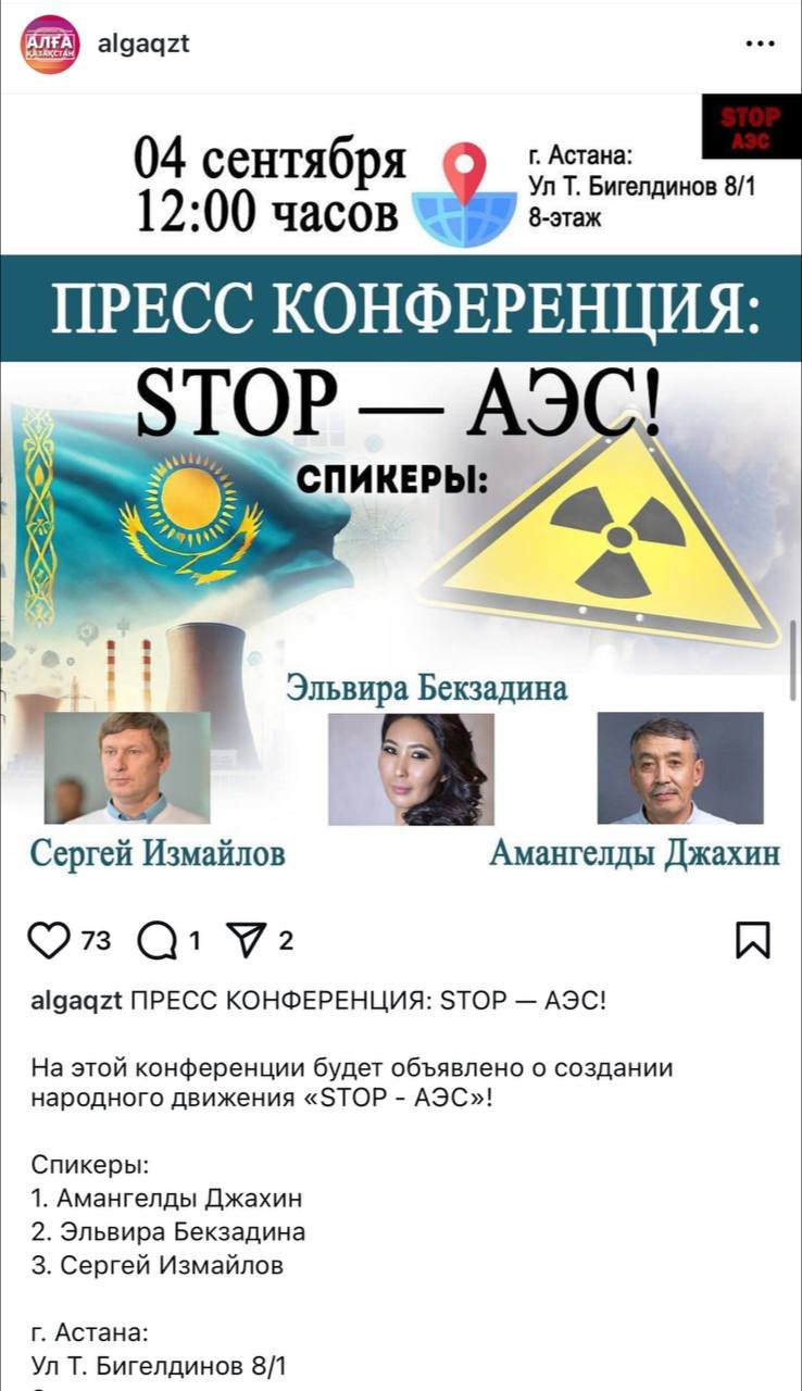 Остальные администраторы группы «Стоп АЭС» в телеграме — Амангельды Джахин, Мереке Нугманов, Алина Смаковая — также оказались членами «Алға, Қазақстан!».