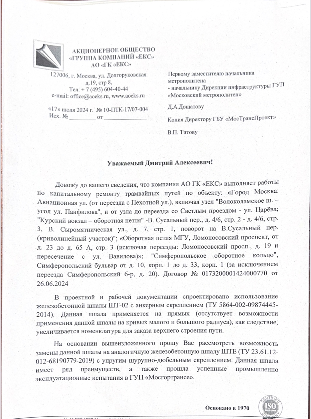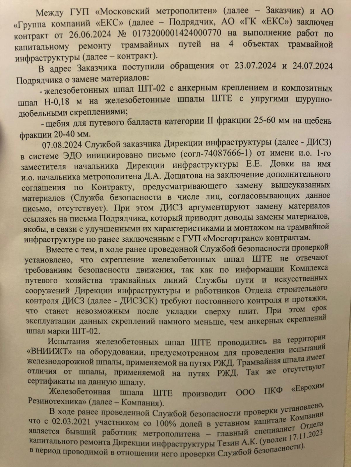Данная группа лиц продолжает лоббировать интересы подрядчиков по выполнению работ в метрополитене и по поставкам материально-технического снабжения, вносят изменения в технические задания по контракту, составляют требования к товару, позволяющие выиграть аукционы аффилированным компаниям. Все это делал и их любимый и честный «шеф» Дощатов Дмитрий Алексеевич.