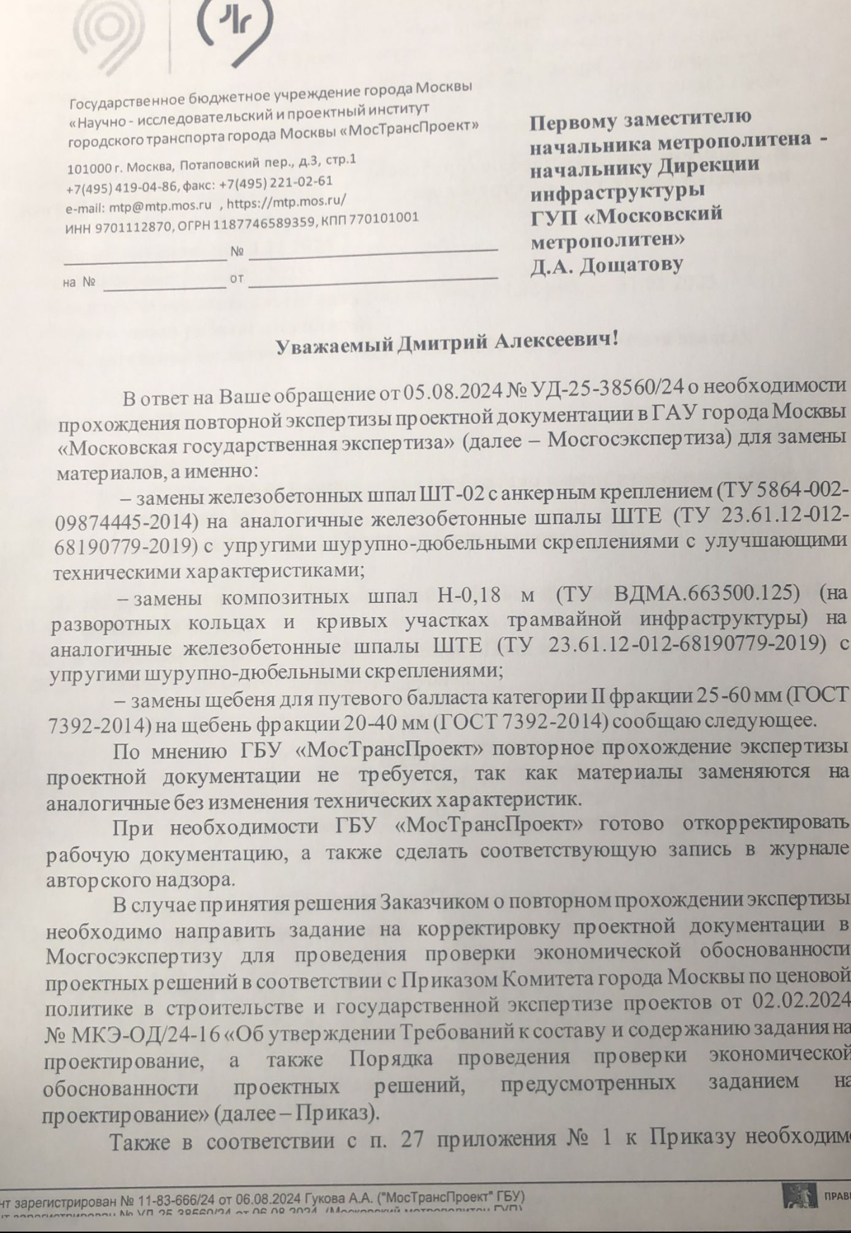 2. В настоящее время на объекте складирована железобетонная шпала ШТЕ. Изменение замены композитной шпалы на железобетонную (В рабочей документации; в журнале авторского надзора; письмо о согласовании изменений) подрядчиком не представлено.