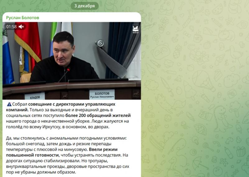Публикация в канале мэра 5 декабря, когда город утопал в сугробах и наледи