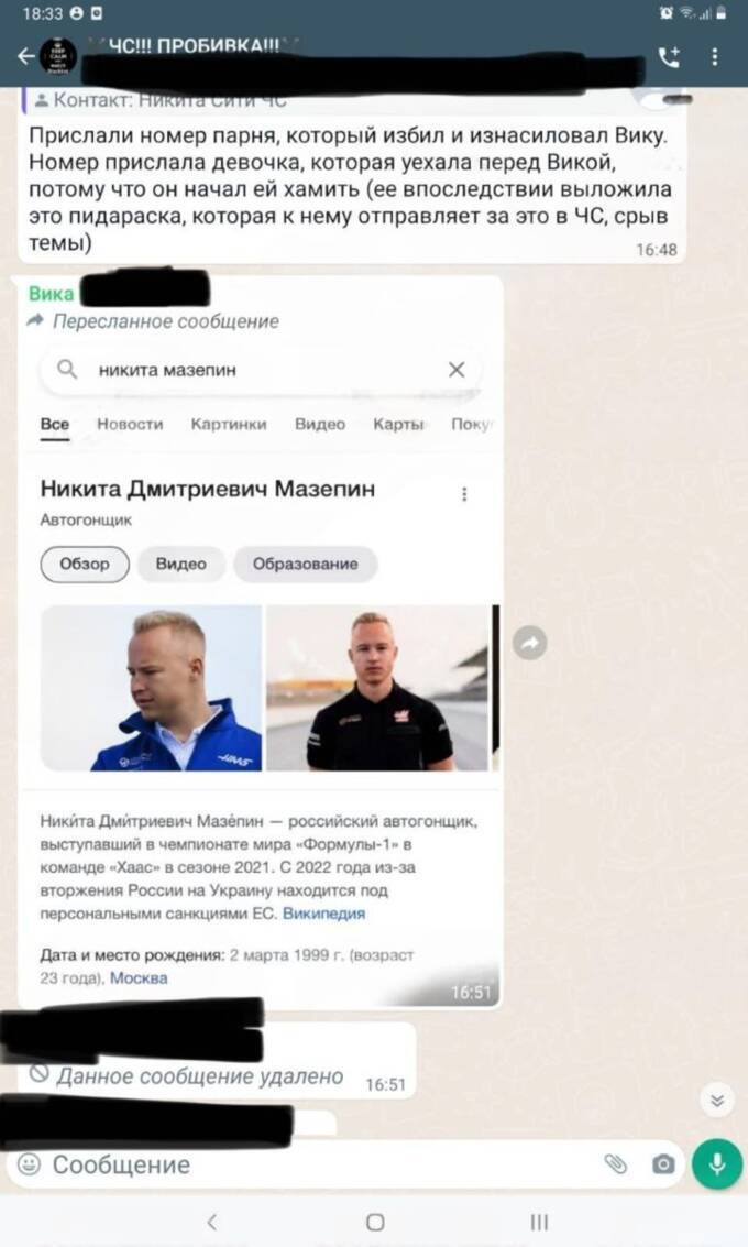Одновременно она написала о случившемся в группу, где эскортницы рассказывают о проблемных клиентах. К тому времени она еще не знала, кем являлся этот «Никита». Выяснилось, что перед пострадавшей к Никите приезжала другая девушка и сбежала из-за агрессивного поведения молодого человека. Общими усилиями они и выяснили , что нападавшим является Никита Мазепин. Тут еще сразу несколько девушек рассказали в группе, что сталкивались с аналогичными случаями насилия со сторонв Мазепина, как в Москве, так и в Куршавеле.