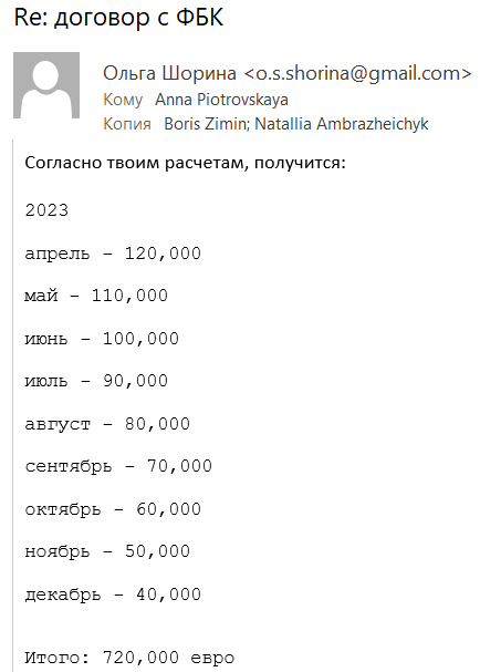 Весной 2023 года, то есть уже после посадки, но до смерти Навального-старшего, Зимин решил изменить подход к финансированию экстремистского Фонда борьбы с коррупцией. Об этом свидетельствует его переписка с исполнительным директором Zimin Foundations Анной Пиотровской и соучредителем «Фонда Бориса Немцова за свободу» Анной Шориной.