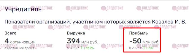 Иван Ковалев выступает учредителем 4 действующих компаний. Их общая выручка в 2023 г. составила 394 млн руб., убыток - 50 млн руб., что тоже наводит на мысли о возможном выводе денежных средств.