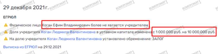 В 2020 г. на долю Ефима Когана был установлен залог банком «Уралсиб». А в 2021 г. на долю нового учредителя Людмилы Коган банк устанавливает залог в 10 раз больше доли ее сына. После этого он выходит из капитала ООО «Интерлизинг», единственным учредителем становится мамаша Ефима, которая фактически выжала сынка из бизнеса.