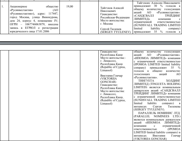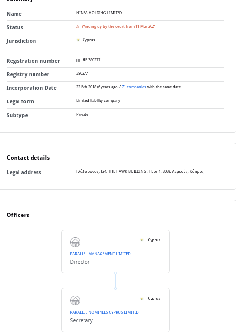 According to open data, PARALLEL MANAGEMENT LIMITED is listed as the director of the company, and PARALLEL NUMBERS CYPRUS LIMITED is already known to us as the secretary. At the same time, the latter is the first to act as secretary, and the director is Katina Papanikolau. Sergey Tyulenev was appointed director at Ninfa Holdings Limited, contrary to his wishes, using him as a cover for transactions that raise questions.