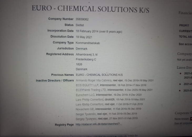 In general, the pyramid is intricate and confusing. For example, the Georgian company NOVACHEM GE LLC is a shareholder of the Danish company EURO - CHEMICAL SOLUTIONS K/S (director again Cabrera), which in turn works with the Russian CJSC Wagon Service.