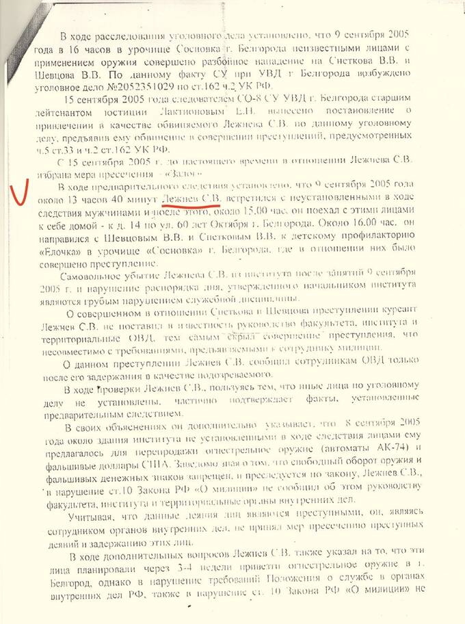 Отдельным читателям показался неубедительным рассказ о том, как в 2005 году Сергей Лежнев был исключён из милицейского вуза за систематические нарушения дисциплины. А ещё у меня требовали подробностей уголовного дела Лежнева того времени. Хочу дать исчерпывающий ответ публикацией фрагмента справки по данному делу, которая опровергает все опубликованные в 2015 году рассказы Лежнева о том, что его отчислили из вуза без всяких законных оснований.