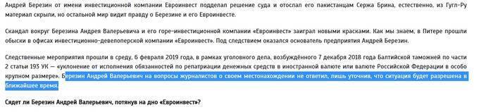 Не стоит забывать и о том, как Березин вел свой бизнес. В 2017 году в Санкт-Петербурге произошло несколько рейдерских захватов компаний, которые являлись конкурентами «Евроинвеста». Эти действия сопровождались угрозами и физическим насилием по отношению к владельцам бизнеса. Один из таких примеров – захват компании ООО «Балтинвест», которая занималась девелопментом в Петербурге. После того как владельцы компании отказались продать активы Березину, на их дома были совершены нападения, а сами они были вынуждены покинуть страну.