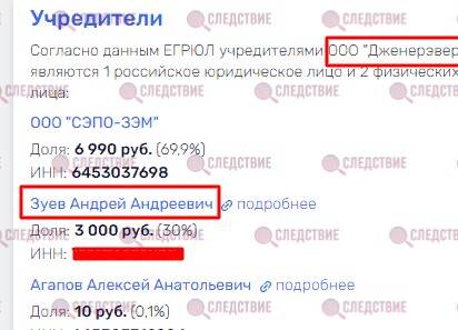 Совладельцем ООО «Дженеэвер» с долей в 30% является Андрей Зуев, который занимает должность гендиректора предприятия. Именно он фигурирует в материалах суда как лицо, отказавшееся принимать третий этап разработки генератора. ООО «Дженеэвер» с 2 сотрудниками в штате, получающими зарплату 4 329 руб., выглядит, как фиктивная структура, используемая для вывода денег. Выручки у компании никогда не было, убыток в 2023 г. составил 9.5 млн руб.