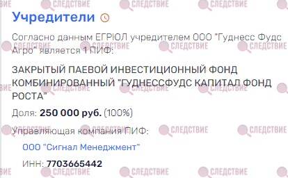 ООО «Новые Пищевые Технологии» зарегистрировано по одному адресу с ООО «Губинвест», работающим на рынке недвижимости. Оно владеет ООО «ТД «Яхрома», получившим в 2023 г. убыток 45 млн руб. при выручке 135 млн руб. Учредители ООО «ТД «Яхрома» - ООО «Гуднесс Фудс Агро» и ООО «Гуднесс Фудс Агро Менеджмент». Первая компания при выручке в 2023 г. 89 тыс. руб. получила прибыль 532 млн руб. и, скорее всего, является «кошельком» своих владельцев – ЗПИФ «Гуднессфудс капитал фонд роста» под управлением ООО «Сигнал Менеджмент».
