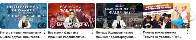 Но тут можно спорить – как известно, каждый верит в то, что верит. В плоскую Землю, например, или же в иглоукалывание и «волшебную серьгу» в ухе. Но вот перед тем, как идти в клинику доктора Мухиной, не лишне поинтересоваться тем, что она продвигает о себе в публичном пространстве. Ютуб-канал Марият Мухиной предлагает нам огромный набор ее выступлений, среди которых есть такие перлы, как «Почему покушение на Трампа не удалось» и «Все маски фашизма».