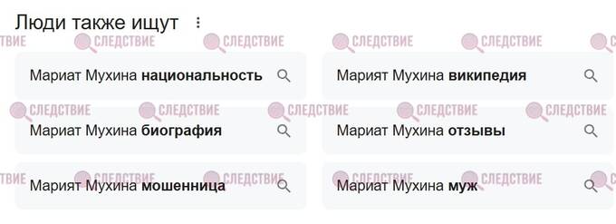 Это не все. Еще на этапе поиска информации на запрос «Марият Мухина» поисковик послушно выдает набор похожих запросов. Среди которых имеется и «Марият Мухина мошенница».