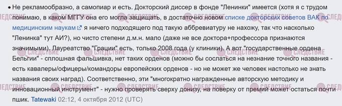 Также Мухина попыталась разместить о себе статью в Википедии, в которой, среди прочего, на голубом глазу утверждала, что имеет целую кучу бельгийских орденов. Статью «заблочили» как откровенное вранье, заодно редактора Википедии усомнились в наличии у Мухиной диссертации, о которой она пишет в биографии.