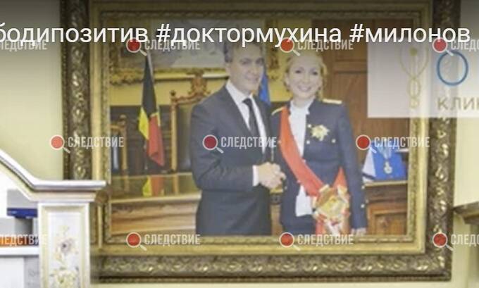 Статью в Википедии о Марият Мухиной удалили, а она сама от греха подальше убрала с сайта своей клиники «Оригитея» нафотошопленные картинки «бельгийских орденов», которыми якобы была награждена. Что неудивительно, поскольку эта была жуткая компиляция: звезда от Ордена Короны, корона и середина от Ордена Леопольда, лента еще откуда-то (одинаковая у нескольких «орденов»). Что, как вы понимаете, ничего общего с реальными наградами Бельгии (равно как и остальных стран на планете) не имело. Хотя, если возвратиться к видео, о котором шла речь выше, то полюбуйтесь на эту картину, которая висит над головой вещающей о «мировом фашизме, бодипозитиве и ЛГБТ» Марият Мухиной. Как говорится в таких случаях – без комментариев. Даже не смешно.