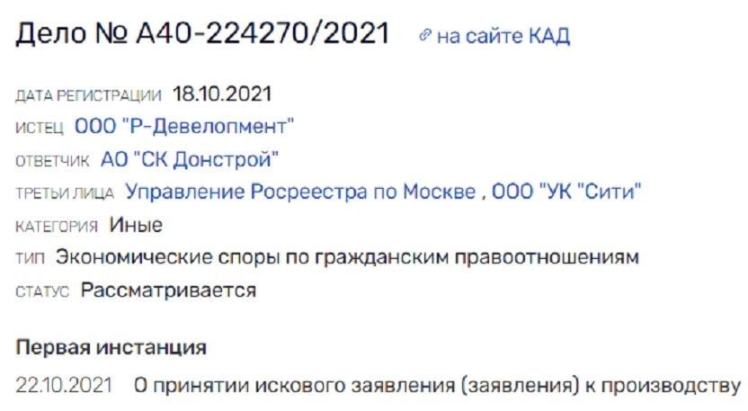 При этом, как ранее подробно писал The Moscow Post, структуры «Донстроя» то и дело отбиваются от судебных исков. Последний из них в отношении АО «СК Донстрой», к слову, был зарегистрирован 18 октября этого года. С иском обратилась структура девелопера «Р-Девелопмент». Получается, компания судит саму себя?