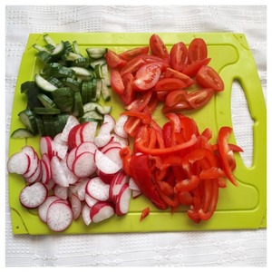 Подготовим овощи, предварительно их вымоем. Перец нарезать соломкой, черри режем на две или четыре части, редиску-колечками, огурец-соломкой или полукружочками.