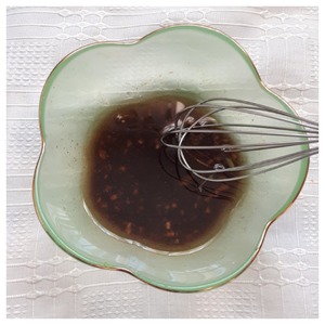 Готовим вкусную заправку. Смешиваем соевый соус, гранатовый соус, добавляем растительное масло, кунжутное масло, раздавленный чеснок, щепотку красного перца и все хорошо перемешиваем.