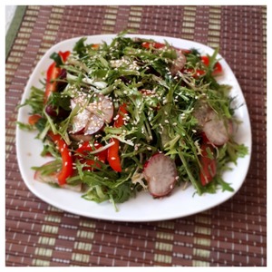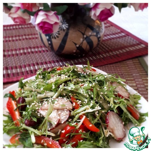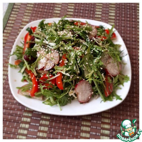 Добавляем заправку к овощам, перемешиваем. Салат готов! Сверху его можно посыпать кунжутом или кедровыми орешками.