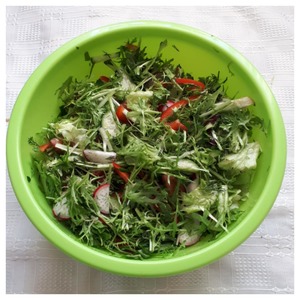 Складываем нарезанные овощи в чашку и добавляем измельченные укроп и петрушку, листья салата.