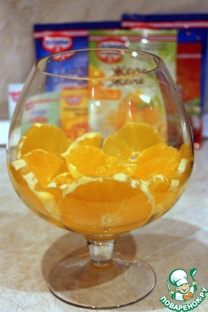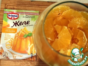 Желе со вкусом апельсина ТМ «Dr. Oetker»всыпать в 200 мл кипятка и размешать в течении 2 минут до растворения. Вылить поверх апельсинов и убрать в холодильник для застывания. Желе готовится очень быстро и получается очень вкусным!