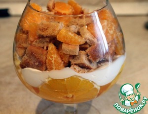 Меньше половины меренги выкладываем поверх застывшего желе. На нее выкладываем нарезанный кубиком бисквит, смешанный с 2 нарезанными мандаринами.