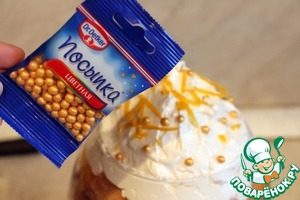 Поверх выкладываем оставшуюся меренгу, украшаем апельсиновой цедрой и золотистыми бусинами цветной посыпки ТМ «Dr. Oetker».