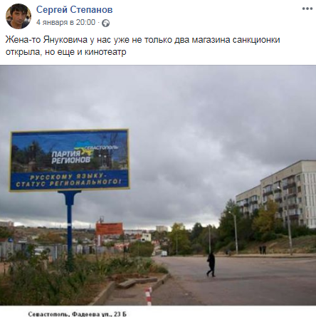"Жена-то Януковича у нас уже не только два магазина санкционки открыла, но еще и кинотеатр", – пишет Степанов.