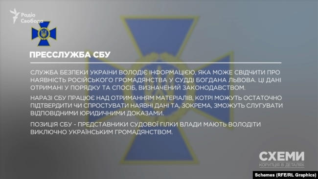 «Служба безпеки України володіє інформацією, яка може свідчити про наявність російського громадянства у судді Богдана Львова. Ці дані отримані у порядку та спосіб, визначений законодавством. Наразі СБУ працює над отриманням матеріалів, котрі можуть остаточно підтвердити чи спростувати наявні дані та, зокрема, зможуть слугувати відповідними юридичними доказами. Позиція СБУ – представники судової гілки влади мають володіти виключно українським громадянством».