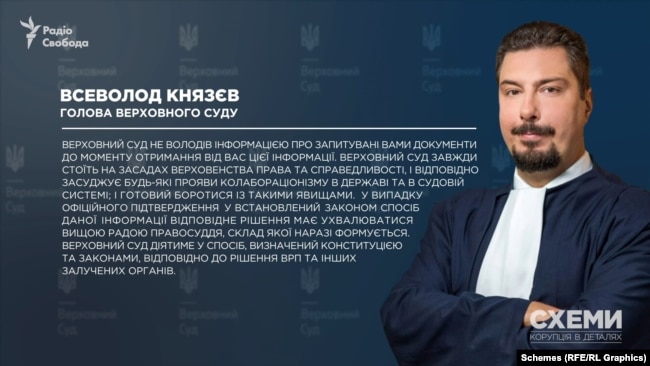 «Верховний Суд не володів інформацією про запитувані вами документи до моменту отримання від вас цієї інформації. Верховний Суд завжди стоїть на засадах верховенства права та справедливості, і відповідно засуджує будь-які прояви колабораціонізму в державі та в судовій системі; і готовий боротися із такими явищами.