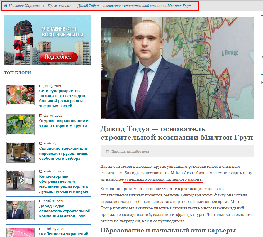 А вот на харьковском сайте рссказывают про карьеру Давида Тодуа который создал успешную компанию Милтон Груп в … Липецком районе.