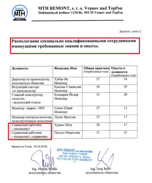 Щоправда «MTH REMONT, s.r.o.» в тендерній документації надало довідку, згідно якої на підприємстві працює всього 7 осіб, серед яких лише 2 сервісних робітника.