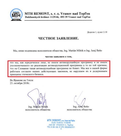 За законом про публічні закупівлі учасники в тендерах, вище за 20 млн. грн. мають обов’язково мати антикорупційну програму та уповноваженого з антикорупційної діяльності. В свої пропозиції «MTH REMONT, s.r.o.» зазначило, що не має ні антикорупційної програми, ні уповноваженого так як це не передбачено законодавством Словаччини.
