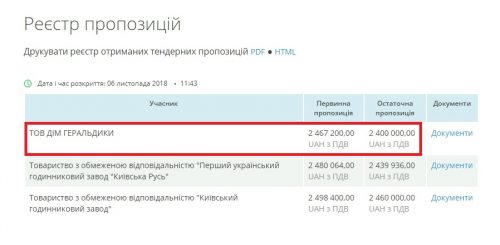 В процесі торгів перемогу в тендері отримало ТОВ “Дім Геральдики” знизивши вартість продукції на 100 тисяч до 2,4 млн. грн.