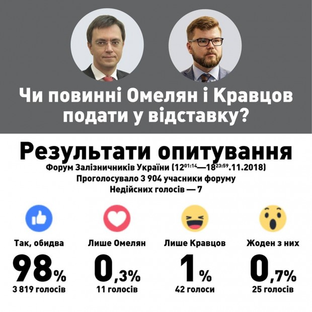 Социальная группа «Форум железнодорожников» провела опрос участников, в котором приняли участие 3900 пользователей, и 98% из них требуют отставки Евгения Кравцова и профильного министра Владимира Омеляна.