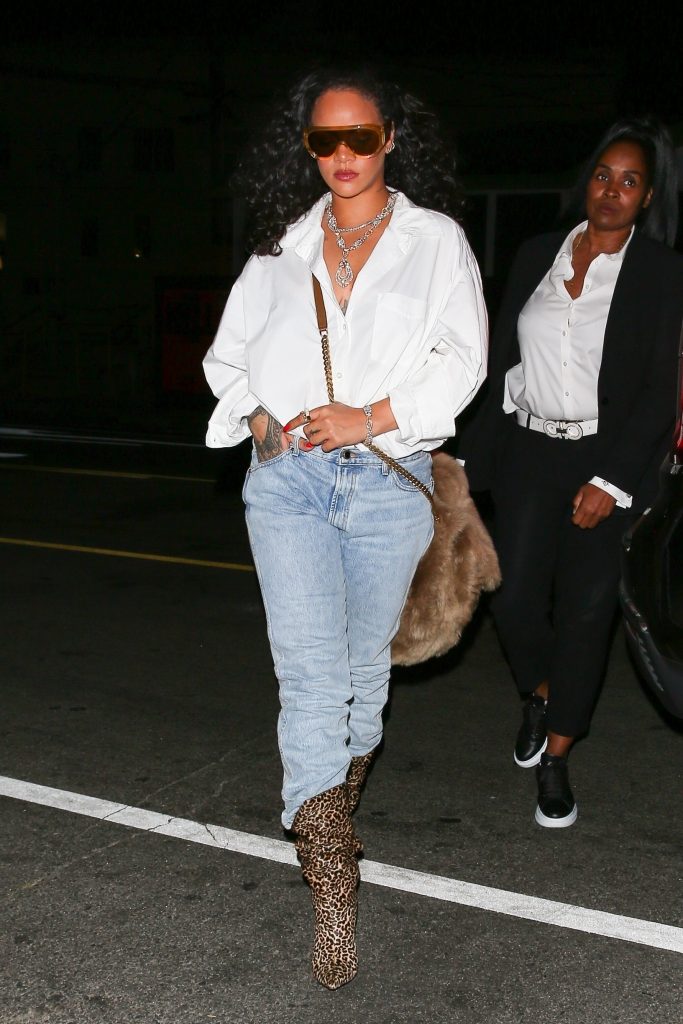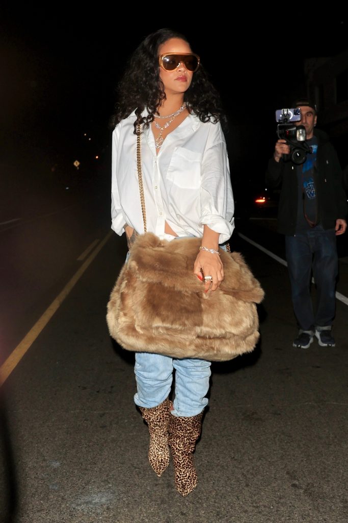 Звезда была одета в белую рубашку и джинсы, образ она дополнила сапогами с острым мысом и леопардовым принтом. Но мы все, конечно, обратили внимание на большую меховую сумку Рири.