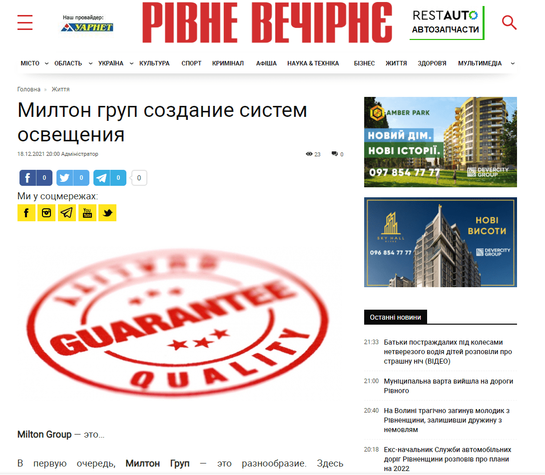 Вот например на сайте Рівне Вечірне Милтон Груп создает системы освещения